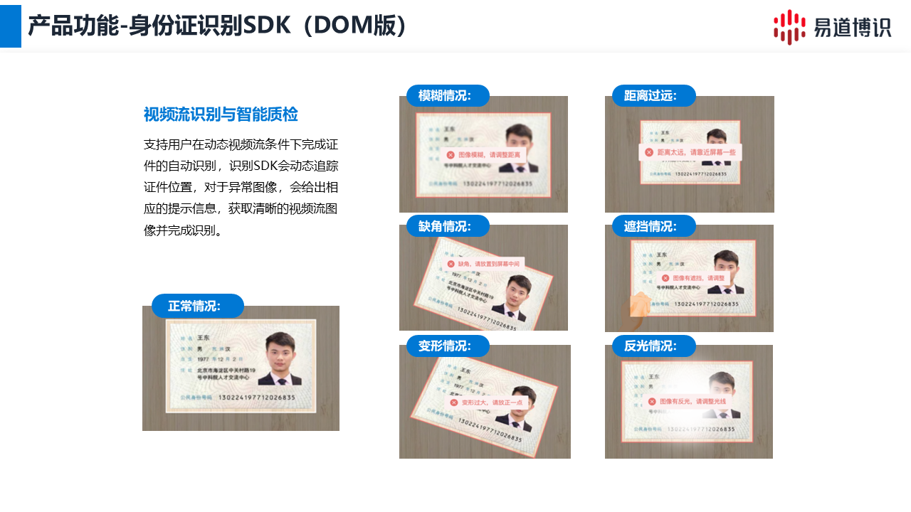 答:支持。行業(yè)領(lǐng)先的解決方案(如易道博識(shí))均提供視頻流動(dòng)態(tài)檢測(cè)功能。這能實(shí)時(shí)追蹤證件在屏幕中的位置,并即時(shí)反饋圖像異常(如反光、模糊),在用戶按下快門(mén)前就引導(dǎo)其拍出合規(guī)照片。