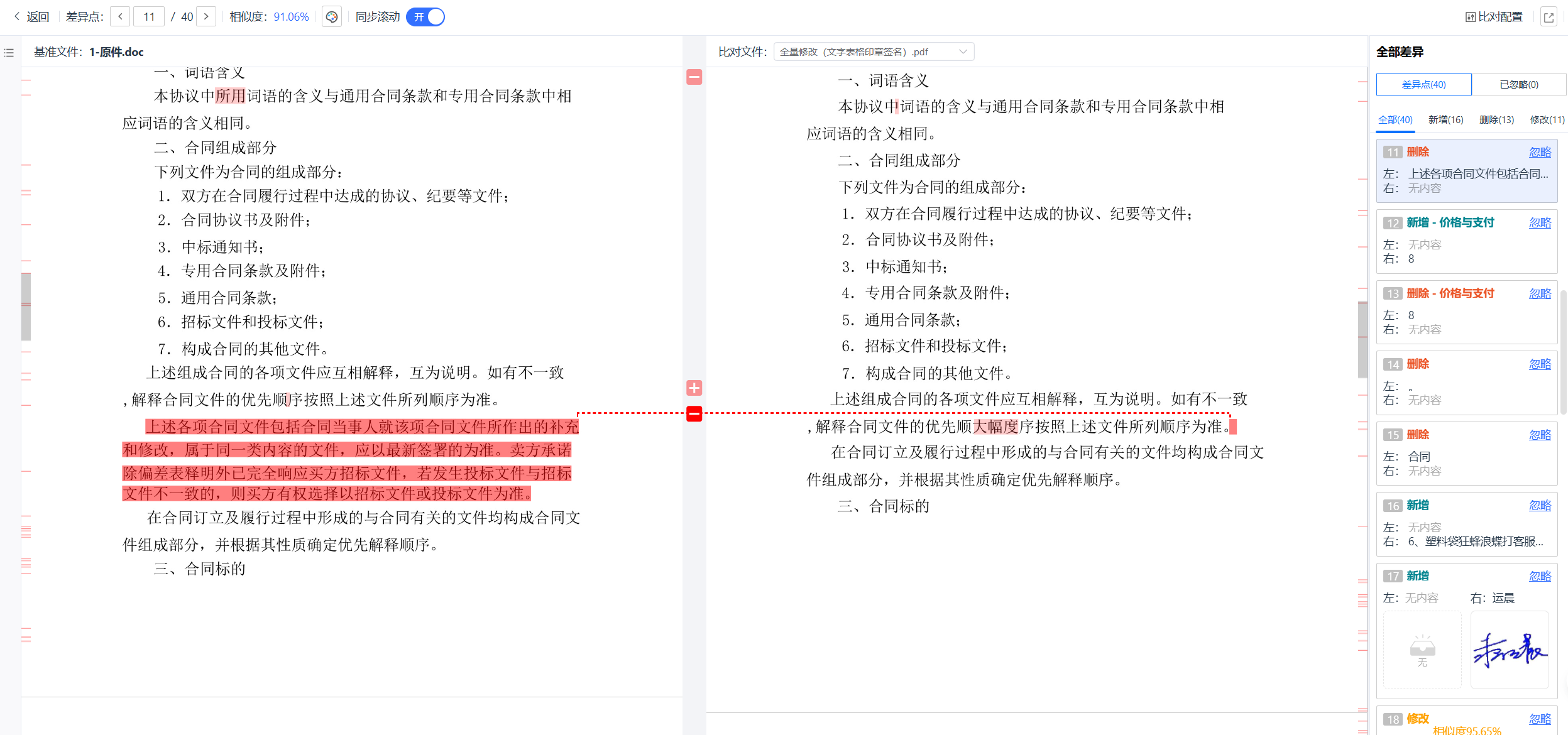 系統會以不同顏色高亮顯示所有【新增】、【修改】、【刪除】的差異,一目了然。專業的比對工具能準確識別跨行、跨頁的段落調整,甚至能檢測到印章、簽名的細微變化。這確保了任何微小的改動都無法逃過審查,防止合同糾錯時出現遺漏。