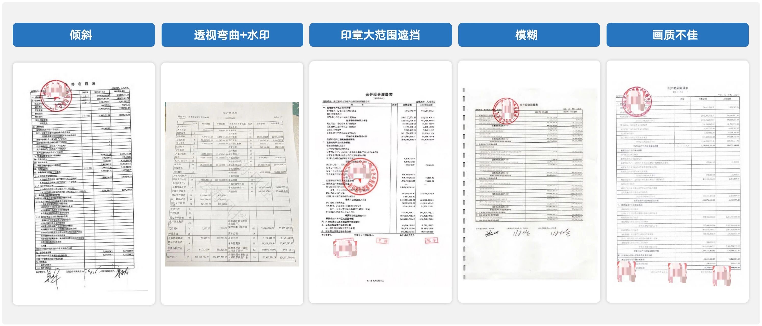 圖像質量不可控。財報格式多樣,還普遍存在傾斜、模糊、透視彎曲、水印干擾等問題,財報識別準確率受限。