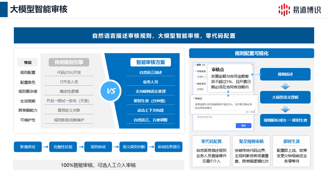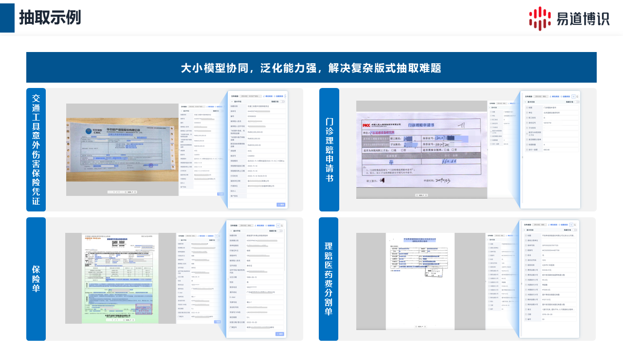 易道博識"AI+保險智能審核解決方案",依托智能文檔工作流DocFlux,大模型賦能理賠審核全鏈路,實現理賠材料自動分類及抽取、規則100%覆蓋。
